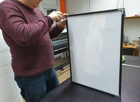 Затем из металлического профиля мы изготавливаем рамку, тыльную сторону которой закрывает прямоугольный белый фон. Распечатанный на плёнке портрет мы приклеиваем к вспененной основе для придания необходимого объёма и жесткости.