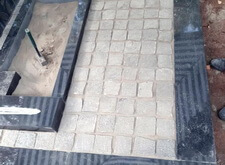 Когда подготовительные работы на территории могилы были завершены, мы принялись за укладку брусчатки на пескобетон, сама плитка была уложена вровень с облицованным гранитными плитами цоколем. Параллельно с этим мы подготовили основание для последующей установки надгробья.