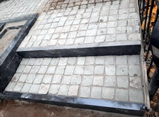 Далее мы приступили к работе над входным проёмом. Ранее он был оформлен горкой, однако мы предложили клиенту вариант с широкой ступенькой, который и был утверждён заказчиком. Для формирования ступеньки нам предстояло для начала демонтировать гранитную брусчатку.